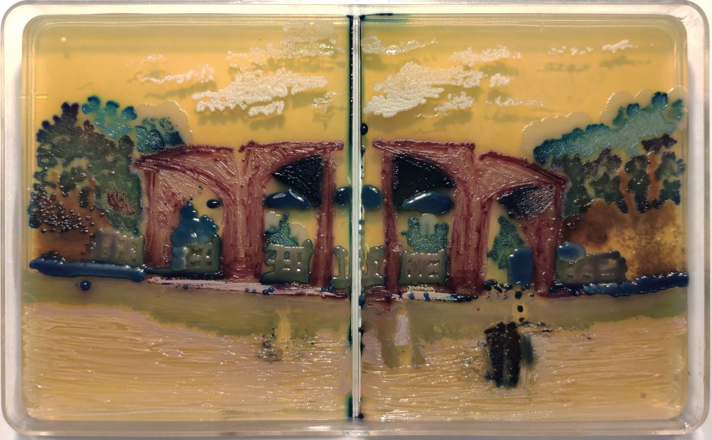 BioArt is an Art Form usually using Biological Material and BioTechnology to Creating Artwork, In The BioArt Category Agar Art is kind of Art using Bacteria, Fungus and Yeast on Agar medium within Petri Dishes. For the First Time I have done this Painting shows the University of Tehran Main Entrance Gate, with a variety of low – risk bacteria in the Modern and safe laboratory in The University Of Tehran. Please Don’t try to do this at Home Maybe not safe.